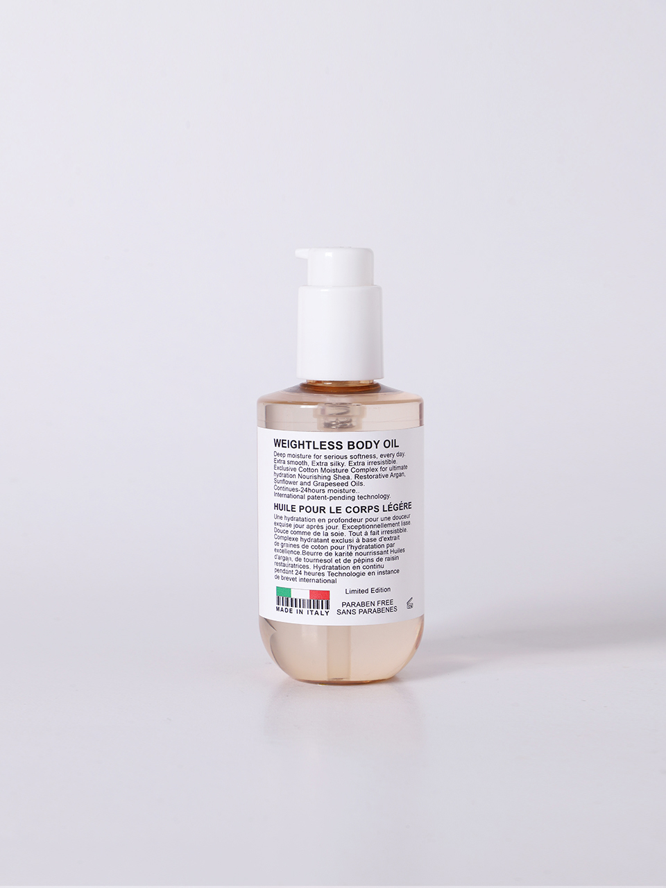 زيت الجسم خفيف الوزن ترطيب عميق لنعومة فائقة ترطيب عميق لنعومة رائعة يومًا بعد يوم. ناعم بشكل استثنائي ناعم كالحرير. مركب ترطيب حصري لا يقاوم تمامًا زبدة الشيا المغذية وزيوت الأرغان وعباد الشمس وبذور العنب المغذية. ترطيب مستمر لمدة 24 ساعة خالي من البارابين آمن للحوامل